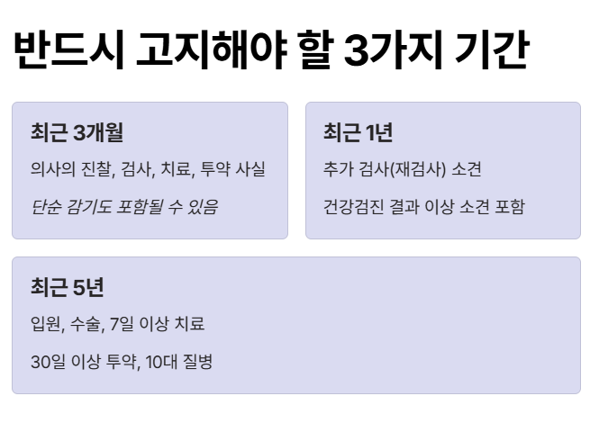 최근 5년 입원, 수술, 7일 이상 치료, 30일 이상 투약 암, 고혈압, 당뇨 등 10대 질병 필수