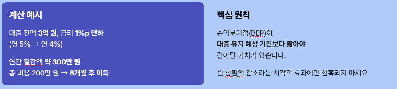 | 금리 차이 | 기존 금리보다 0.5%p 이상 낮을 때 | 금리 차이가 0.2%p 미만일 때 |