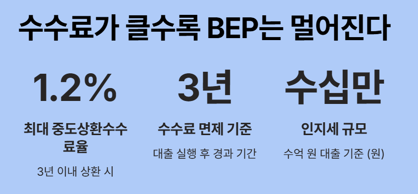 | 대출 기간 | 실행 후 3년이 경과하여 수수료가 없을 때 | 실행 후 1년 미만이라 수수료가 높을 때 |