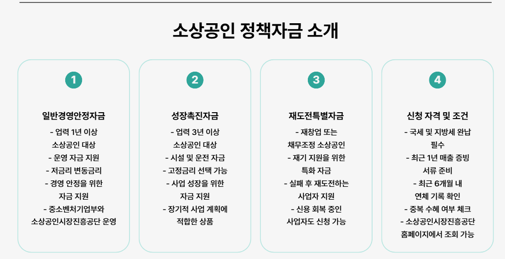 | 일반경영안정자금 | 업력 1년 이상 소상공인 | 운영 자금 지원, 저금리 변동금리 |