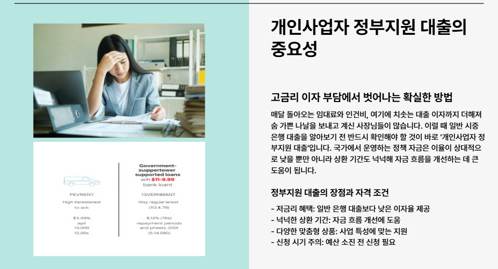 매달 돌아오는 임대료와 인건비, 여기에 치솟는 대출 이자까지 더해져 숨 가쁜 나날을 보내고 계신 사장님들 많으시죠? 이럴 때 일반 시중 은행 대출을 알아보기 전 반드시 확인해야 할 것이 바로 개인사업자 정부지원 대출입니다.