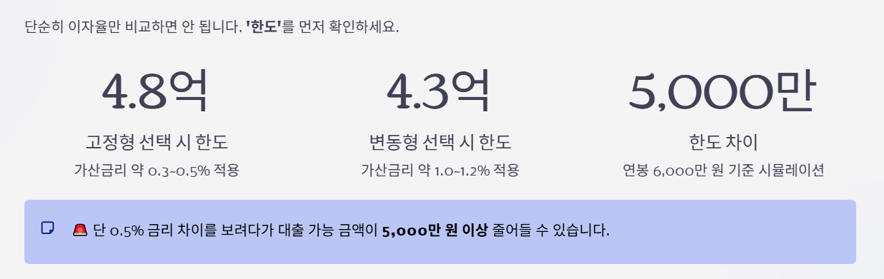 - 고정형(주기형) 선택 시: 가산금리 약 0.3~0.5% 적용 → 한도 약 4억 8천만 원