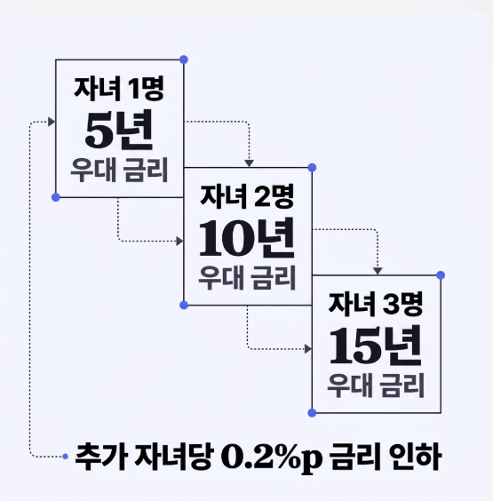신생아 특례대출의 진가는 '둘째, 셋째'를 낳았을 때 발휘됩니다. 아이를 한 명 더 낳을 때마다 금리가 0.2%p 인하되고, 특례 기간이 5년 연장됩니다.