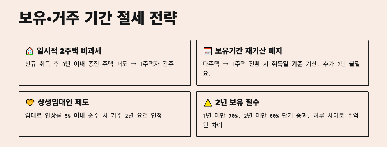2년 미만 보유 시 단기 양도세율(1년 미만 70%, 2년 미만 60%)이 적용되어 세금 폭탄을 맞습니다. 단 하루 차이로 수억 원이 갈릴 수 있습니다.