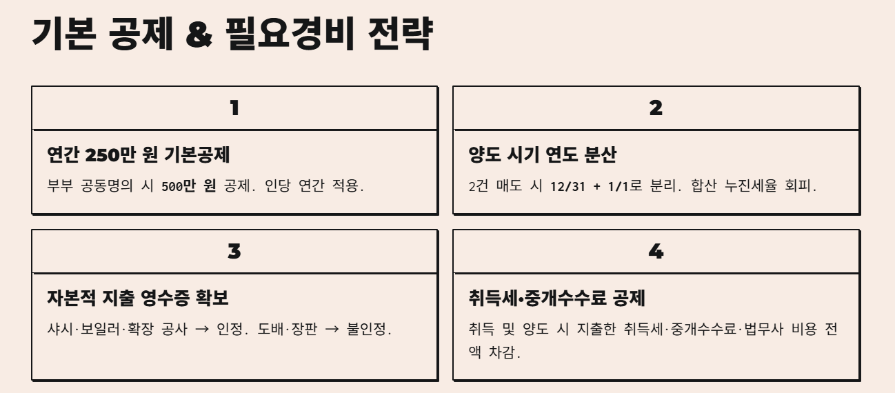 양도세 기본공제는 인당 연간 250만 원입니다. 부부 공동명의라면 각각 250만 원씩 총 500만 원의 과세표준을 줄일 수 있습니다.