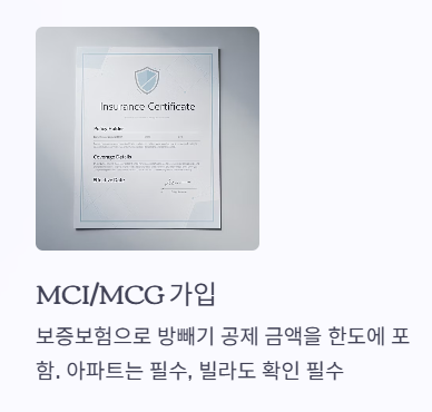 - MCI/MCG 가입: '방빼기'로 깎이는 금액을 보증보험 가입을 통해 한도에 포함시키는 방법입니다. 아파트는 거의 필수이며, 빌라도 가입 가능 여부를 꼭 확인하세요.