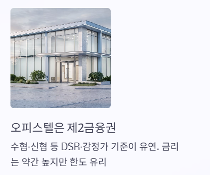 - 오피스텔은 제2금융권 활용: 제1금융권보다 금리는 약간 높지만, DSR 규제나 감정가 평가에서 더 유연한 기준을 적용하는 수협, 신협 등을 비교해 보세요.