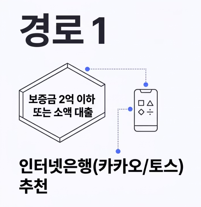 수도권의 비싼 전셋집(보증금 5억 초과)을 구한다면 한도가 5억 원까지 나오는 시중은행(SGI 연계)이 유리합니다. 반면, 2억 원 내외의 대출로 충분하다면 간편한 인터넷은행이 압승입니다.