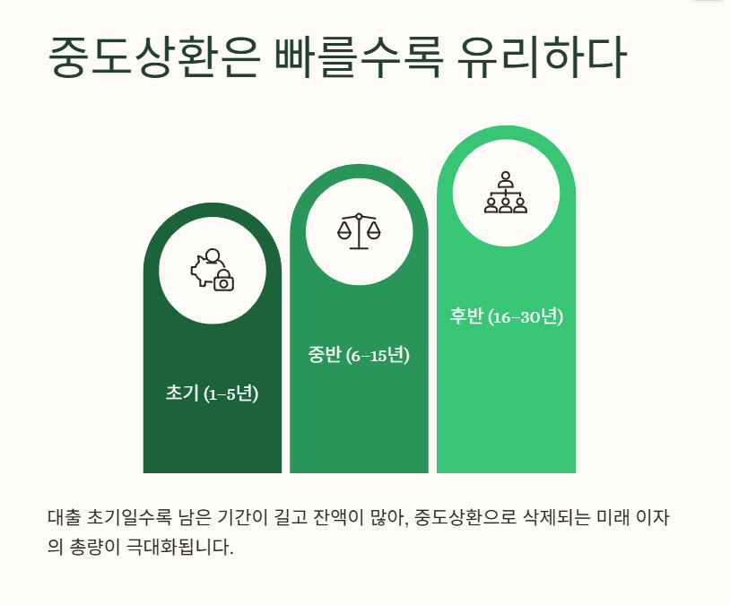 중도상환은 '빨리 할수록' 유리하다는 것이 정설이지만, 방식에 따라 전략이 다릅니다.