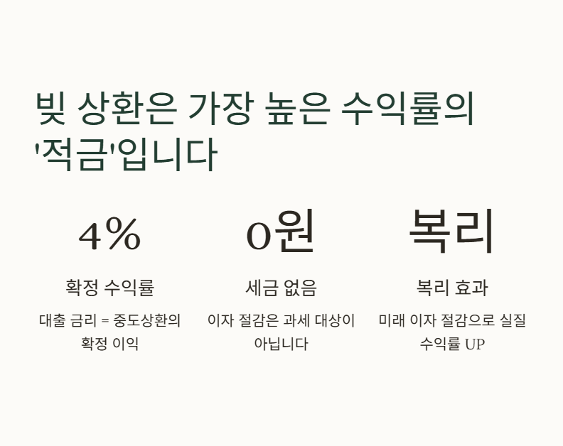 대출 이율이 4%라면, 중도상환은 연 4%의 확정 이익을 주는 상품에 가입하는 것과 같습니다. 여기에 복리 효과(미래 이자 절감)까지 더해지면 실질 수익률은 더 높아집니다.