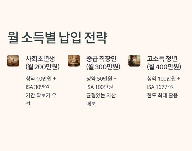 - 납입 우선순위: 청약 통장에 최소 인정 금액(10만 원) 납입 후, 나머지는 ISA에 투자하세요.