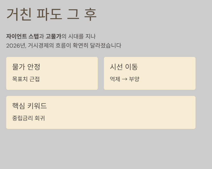 2026년 기준금리 전망의 흐름을 한 문장으로 요약하자면 "거친 파도는 지났고, 이제 잔잔한 물결을 준비할 때"라고 할 수 있습니다.