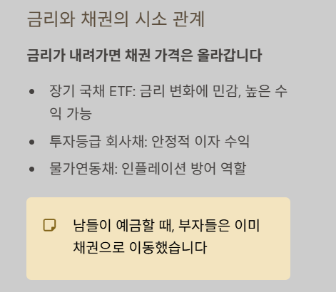 - ✅ 채권 비중 확대: 금리가 내려가면 채권 가격은 오릅니다. 장기 채권 ETF 등을 눈여겨보세요.