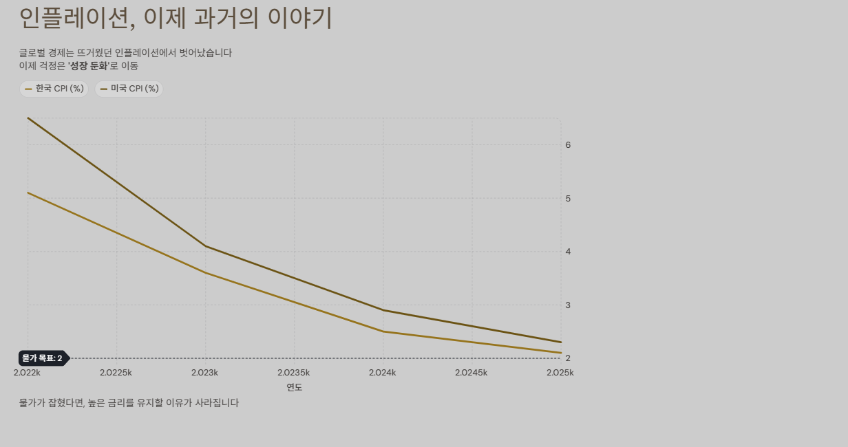 | 낙관적 (연착륙) | 2.0% ~ 2.5% | 물가 안정 + 소비 회복 성공 |