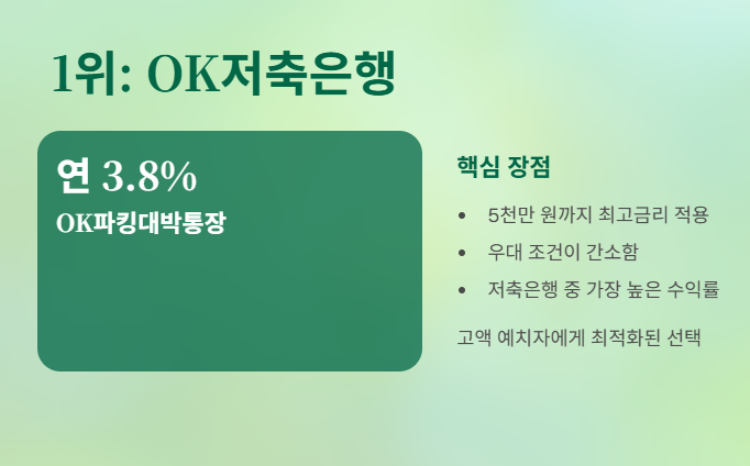 | 1 | OK저축은행 (OK파킹대박통장) | 3.8% | 5천만 원까지 최고금리, 조건 간소 |