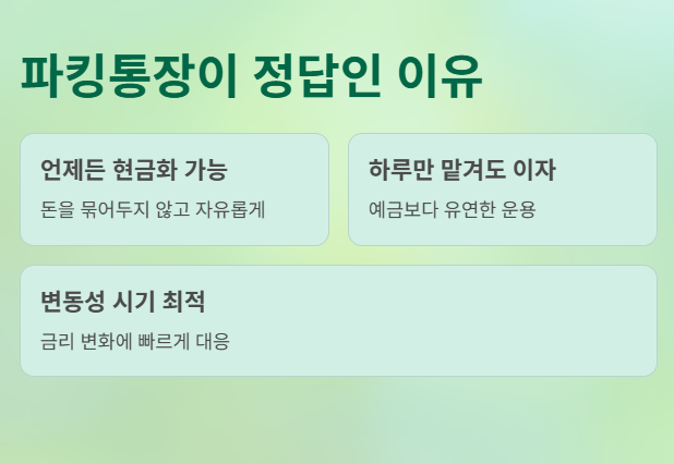 지금처럼 변동성이 큰 시기에는 돈을 묶어두는 예금보다는, 언제든 현금화할 수 있으면서도 하루만 맡겨도 이자가 붙는 파킹통장이 최고의 대안입니다. 여러분은 지금 비상금을 일반 수시입출금 통장에 0.1% 이자를 받으며 방치하고 있지는 않나요?