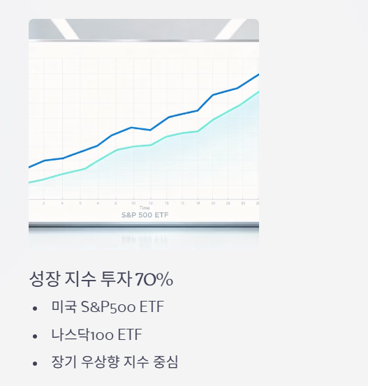- 성장 지수 투자 (70%): 미국 S&P500 ETF, 나스닥100 ETF 등 우상향 지수에 투자하여 장기 수익률을 챙깁니다.