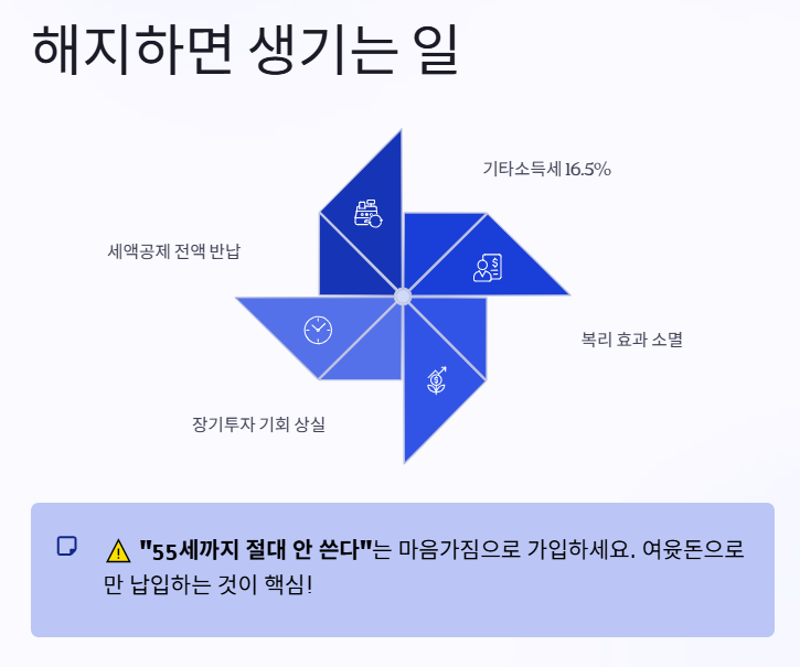중도에 계좌를 해지하면 그동안 받았던 세액공제 혜택을 모두 반납해야 합니다. 기타소득세 16.5%가 부과되는데, 이는 공제받았던 금액보다 더 큰 손실이 될 수 있습니다. "무조건 55세까지 안 쓴다"는 마음가짐이 필요합니다.