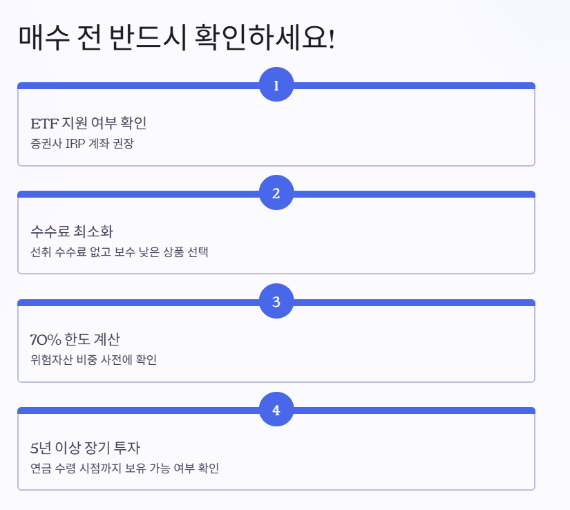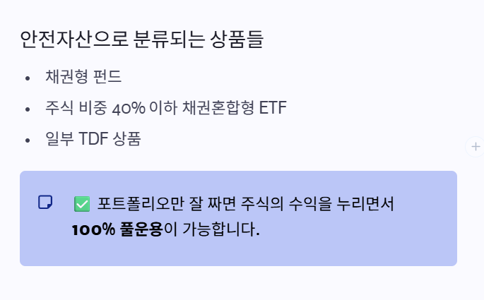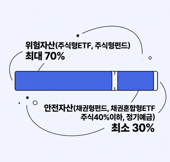나머지 30%는 무조건 예금만 넣어야 할까요? 아닙니다. 채권형 펀드나 TDF 상품 중 일부, 그리고 주식 비중이 40% 이하인 채권혼합형 ETF 등은 '안전 자산'으로 분류되어 100%까지 담을 수 있습니다. 즉, 포트폴리오만 잘 짜면 주식의 맛을 보면서도 꽉 찬 운용이 가능합니다.